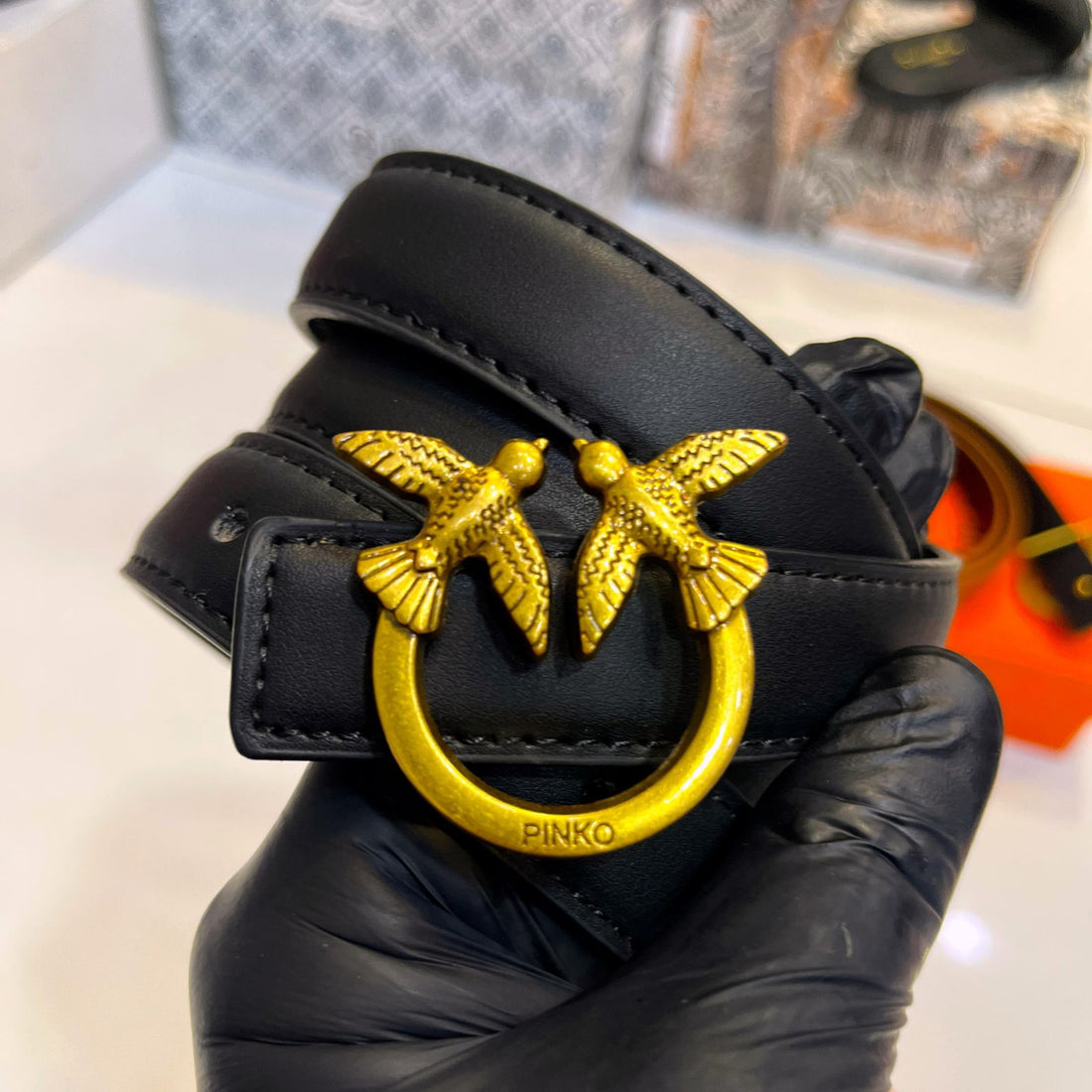 Style: Fashion-forward and versatile women’s belt Material: High-quality leather or leather-look material Buckle: Signature Pinko...